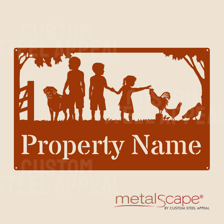 Give your entrance the standout it deserves with our eye-catching farm property sign – a striking blend of rural pride and durable craftsmanship. Featuring laser-cut silhouettes of children, a dog and chickens, this design adds a personal and welcoming touch to any gate, driveway, or shed. Made from quality weathering steel (not mild steel), it naturally develops a rich rusted patina over time, blending beautifully with the Aussie landscape. Whether you’re showcasing your animals, naming your property, or simply adding character, this custom-made sign is built to last.