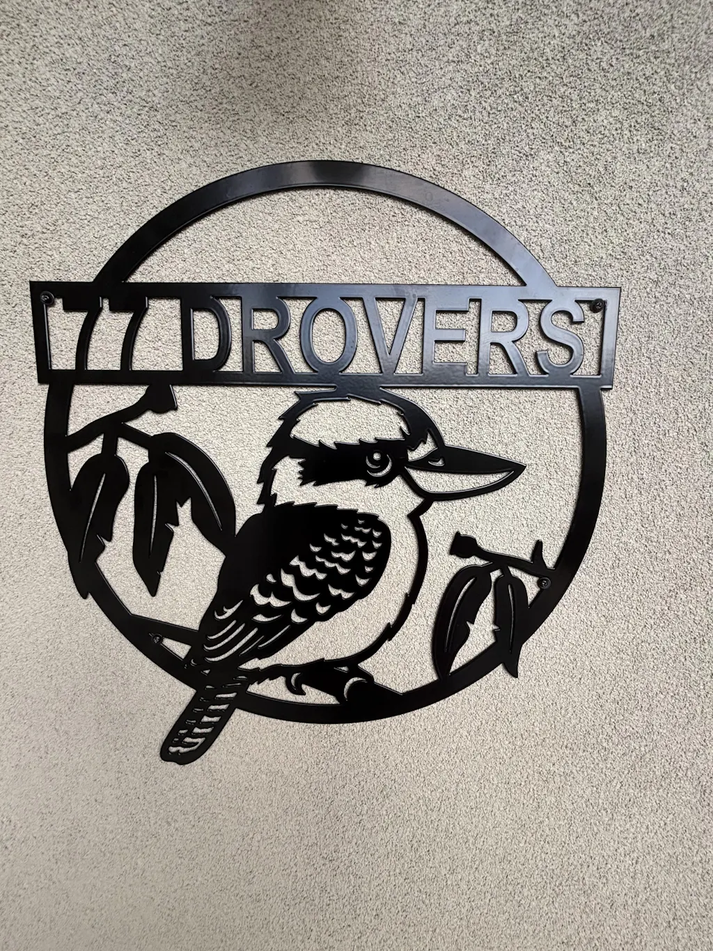 Welcome guests to your home with a touch of Australian charm with our custom Kookaburra Property Sign. This stunning laser-cut metal sign features a beautifully detailed kookaburra perched on a branch, surrounded by native foliage. Perfect for enhancing the visibility of your address or simply adding a warm, inviting touch to your entrance, this sign is both functional and decorative.